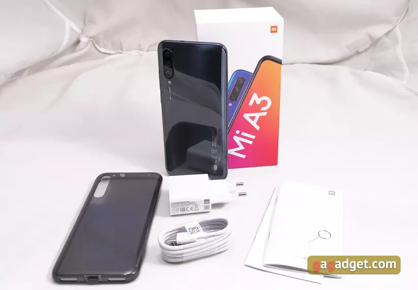 Xiaomi Mi A3 jest w standardowym białym pudełku z wizerunkiem smartfona i krótką informacją techniczną. Zestaw jest prawie standardowy: smartfon, kabel USB Type-C, ładowarka 10 W, narzędzie do wysuwania tacy, ciemnoszary silikonowy futerał i dokumentacja.