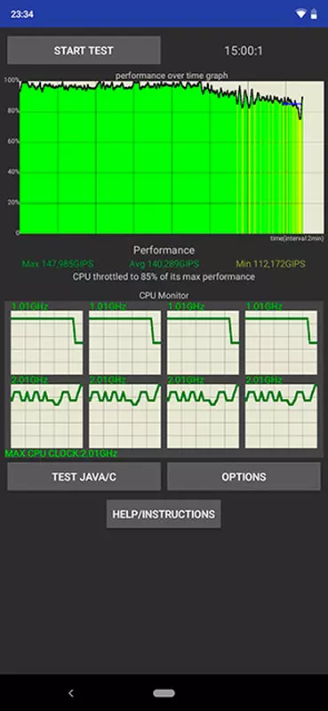 W teście dławienia procesor działał bardzo dobrze: pod koniec testu wydajność spada do 85%, a obudowa nie nagrzewa się: